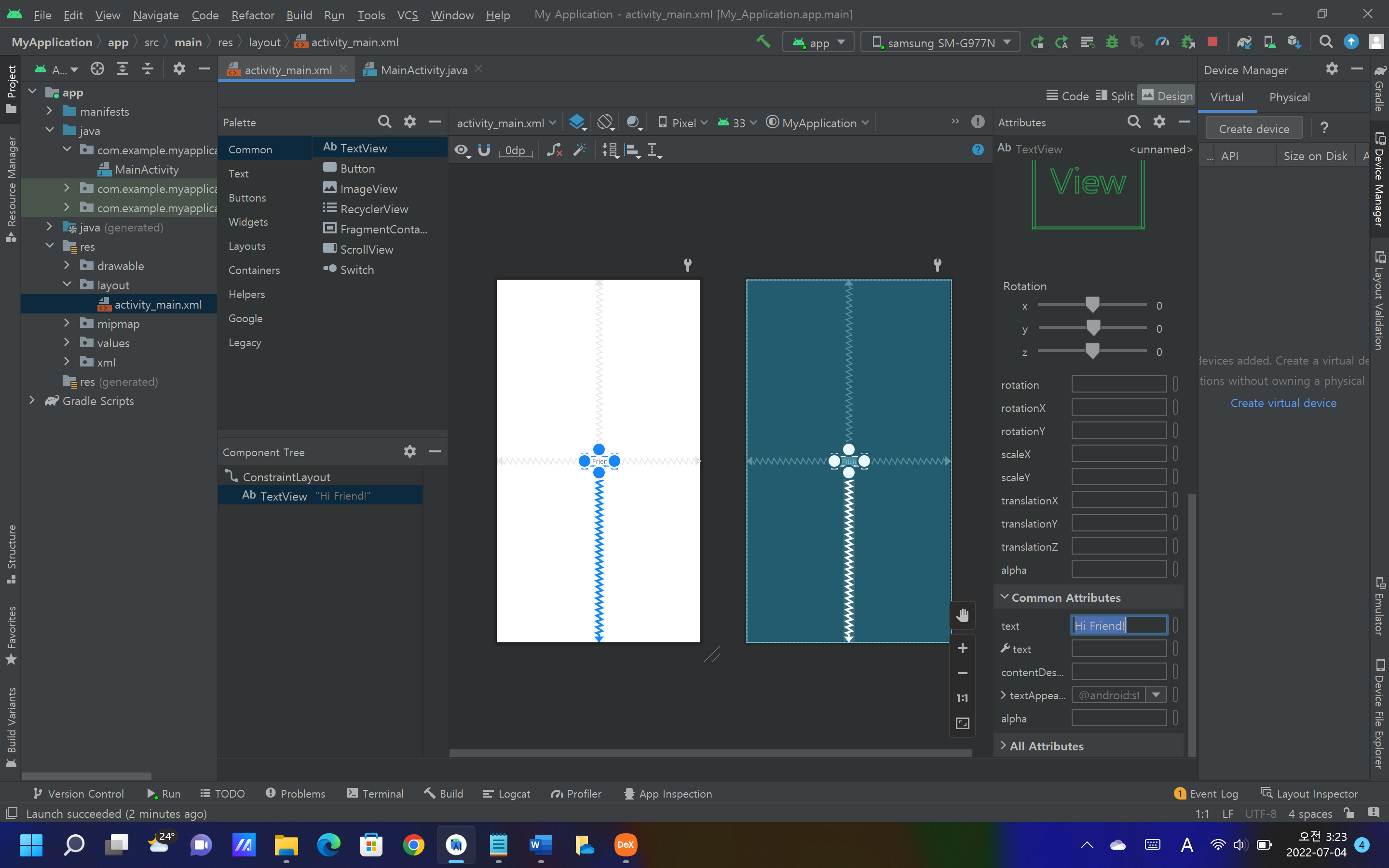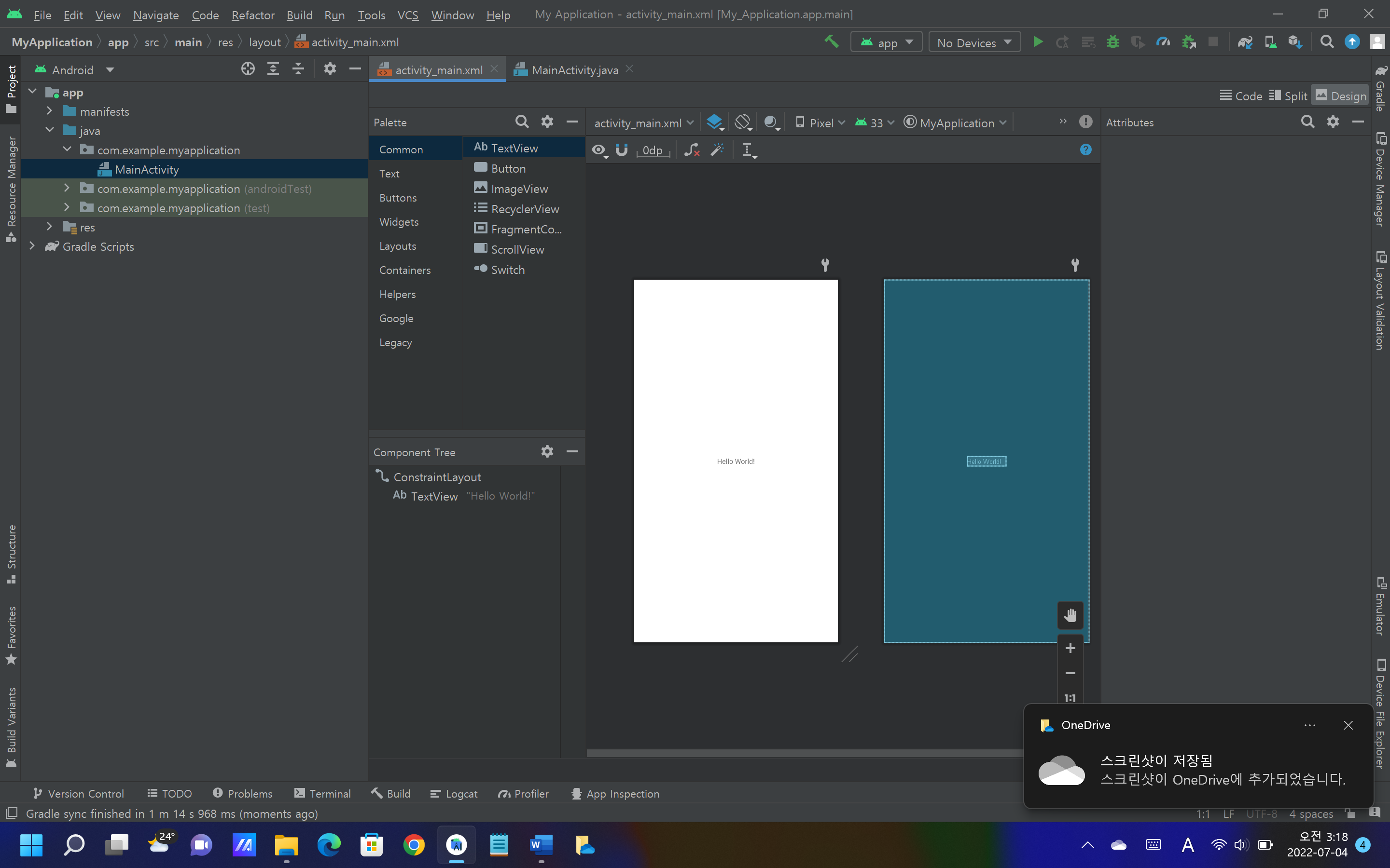 하나는 "MainActivity.java" 라는 창과 다른 하나는 "activity main_xml" 이 보인다.