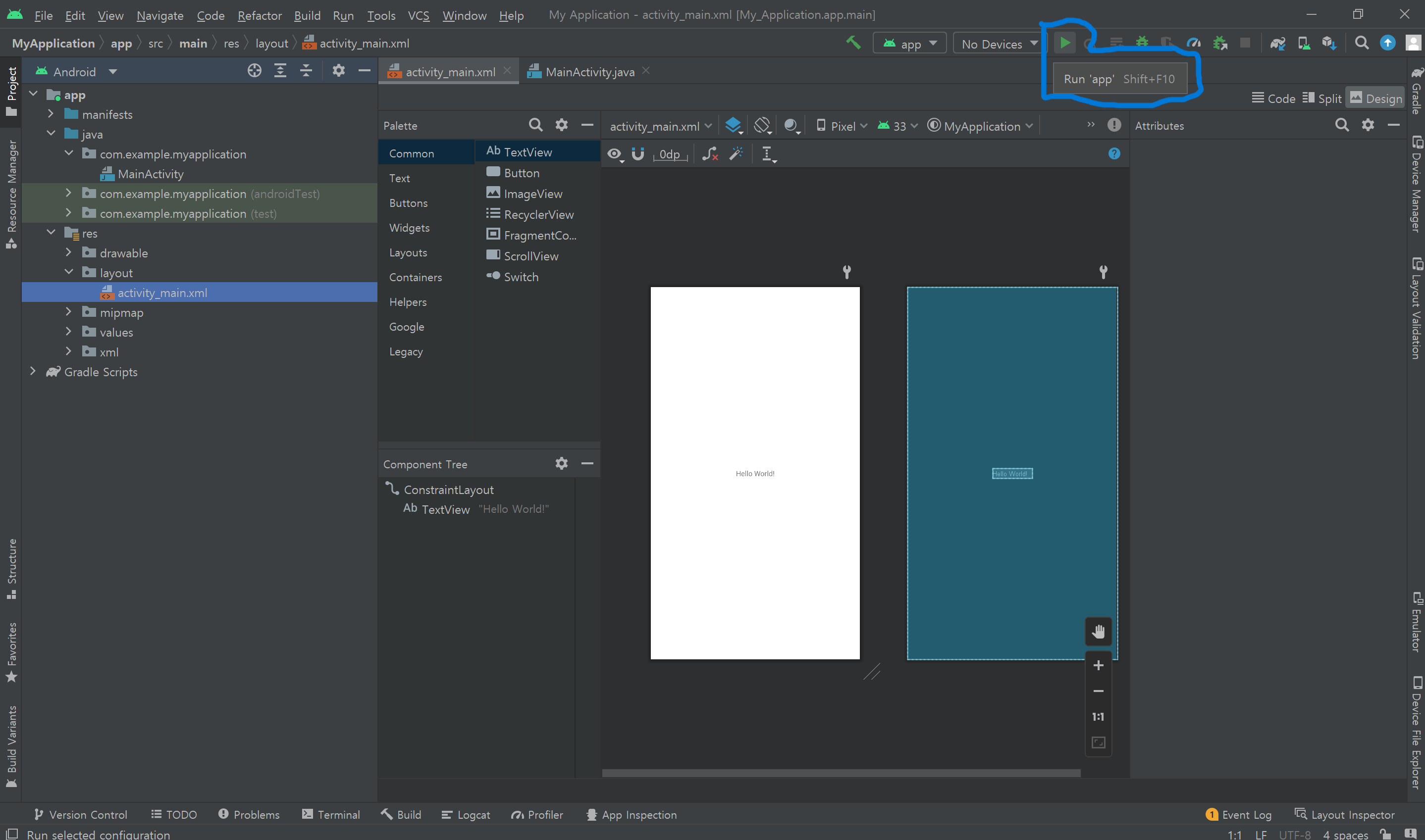 우선은 첫 프로젝트를 시작할때 "MainActivity.java"에 있던 코드를 살펴보자