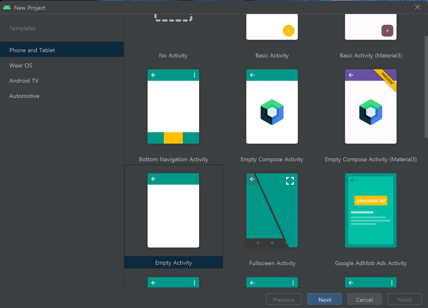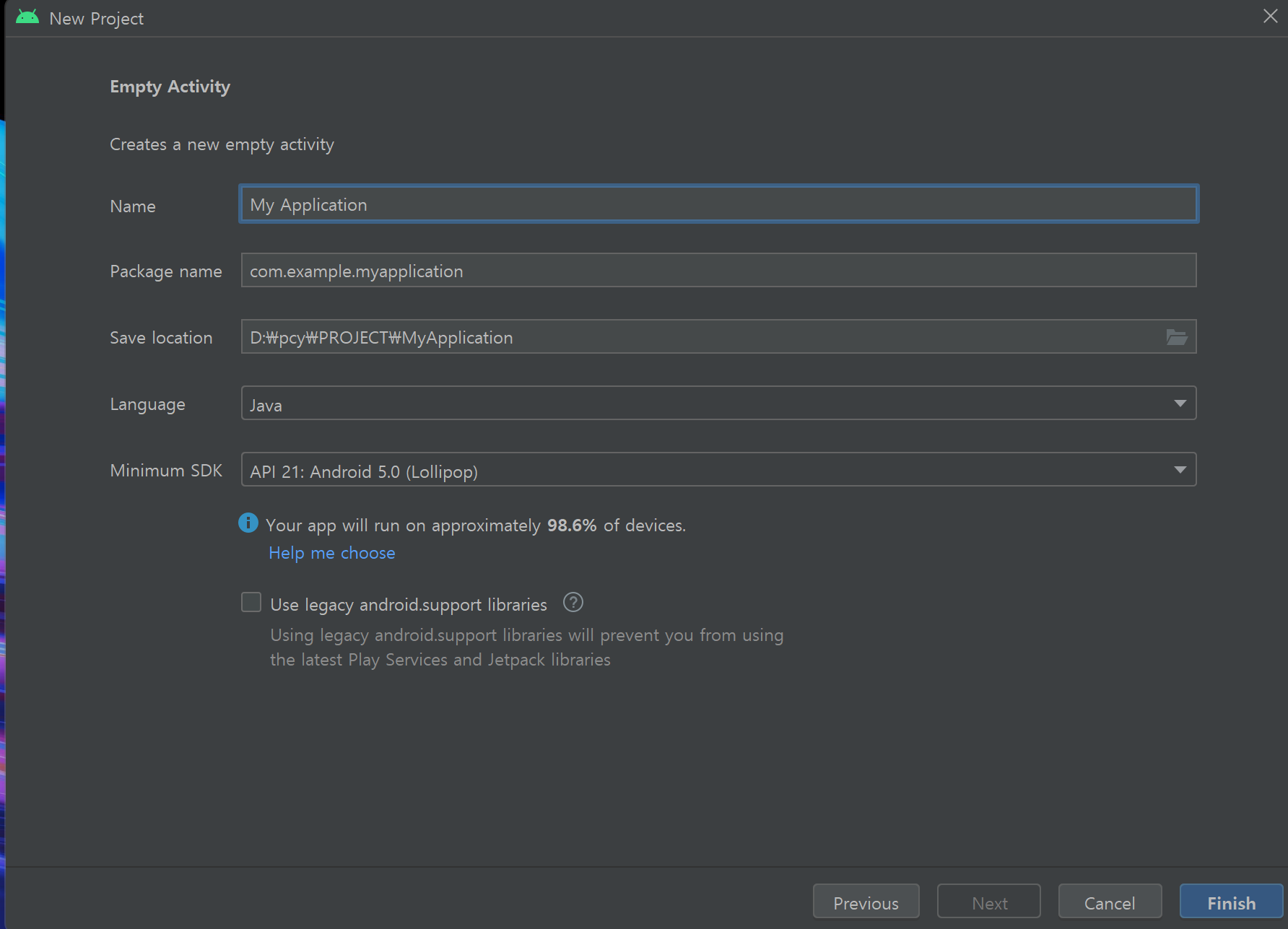 일단은 "Empty Activity"를 선택한후 "Next"를 눌러 다음으로 넘어가 보자