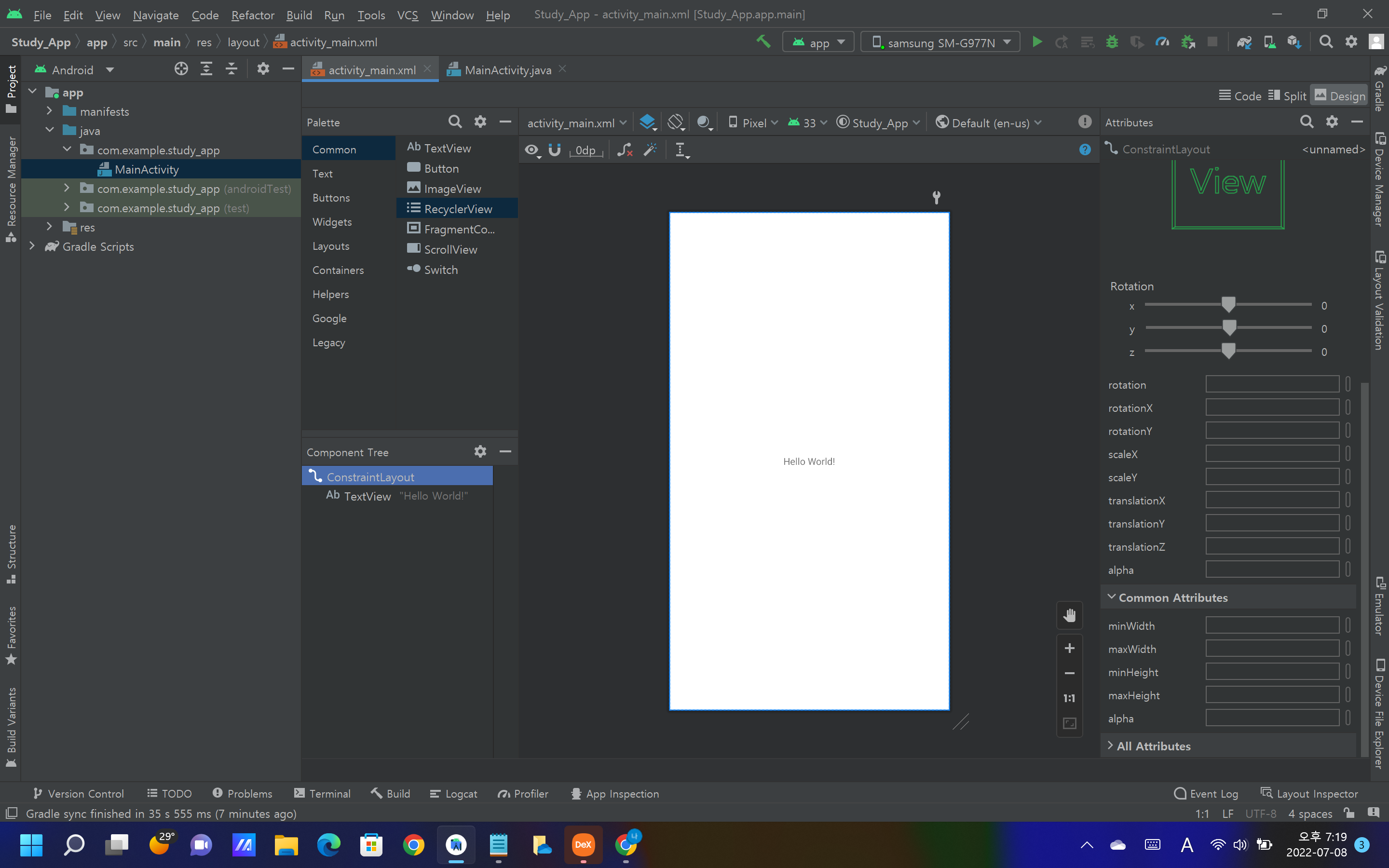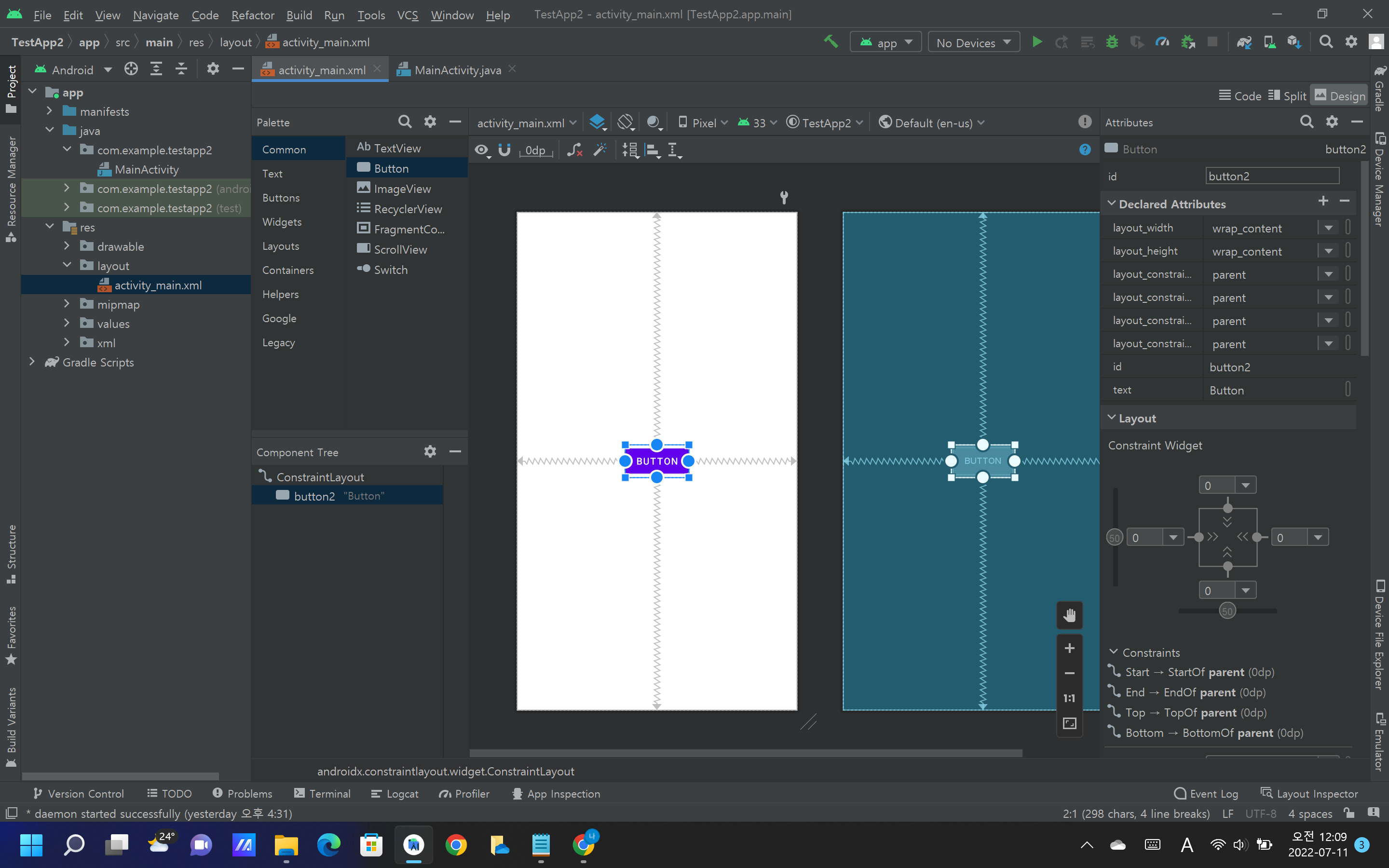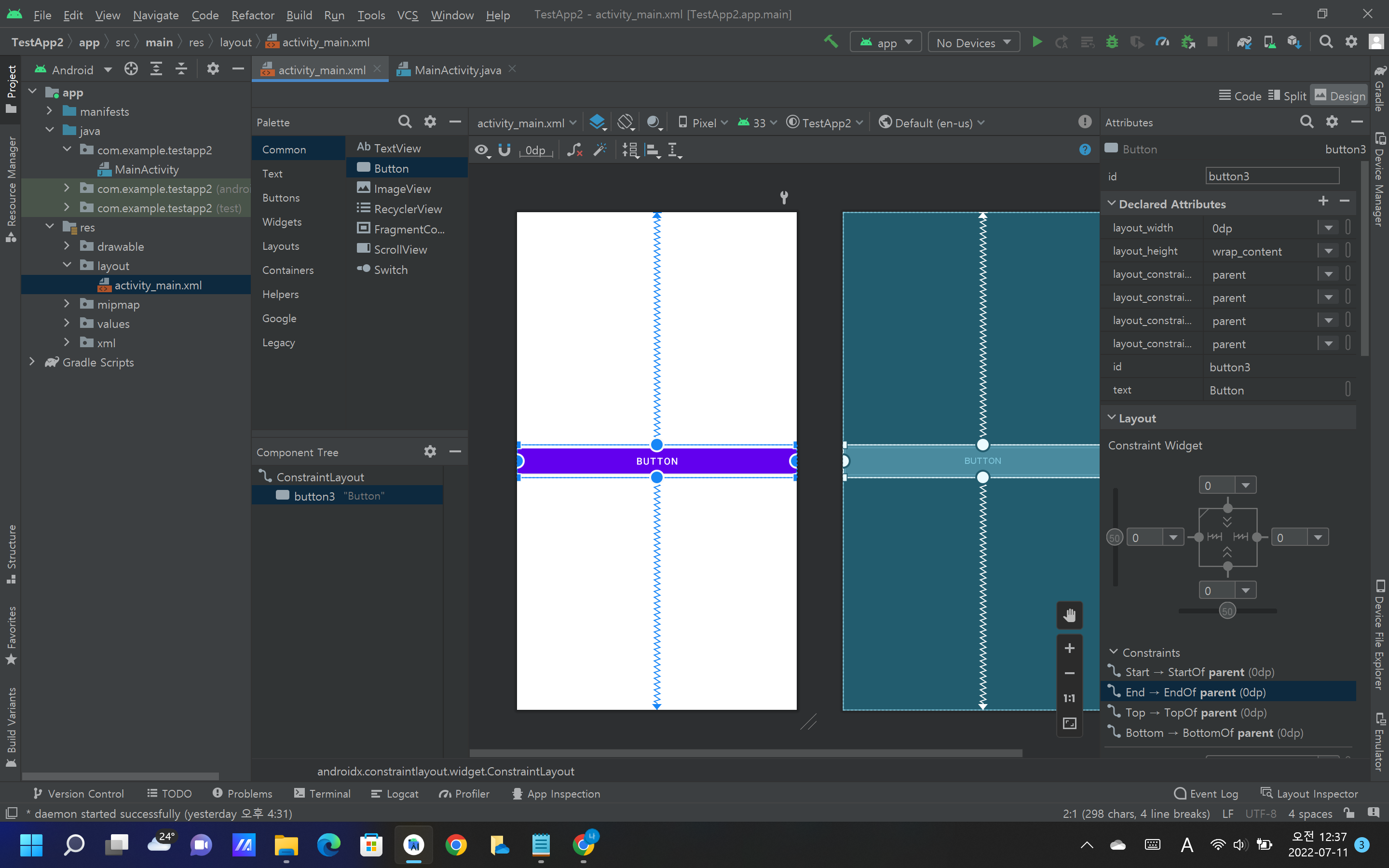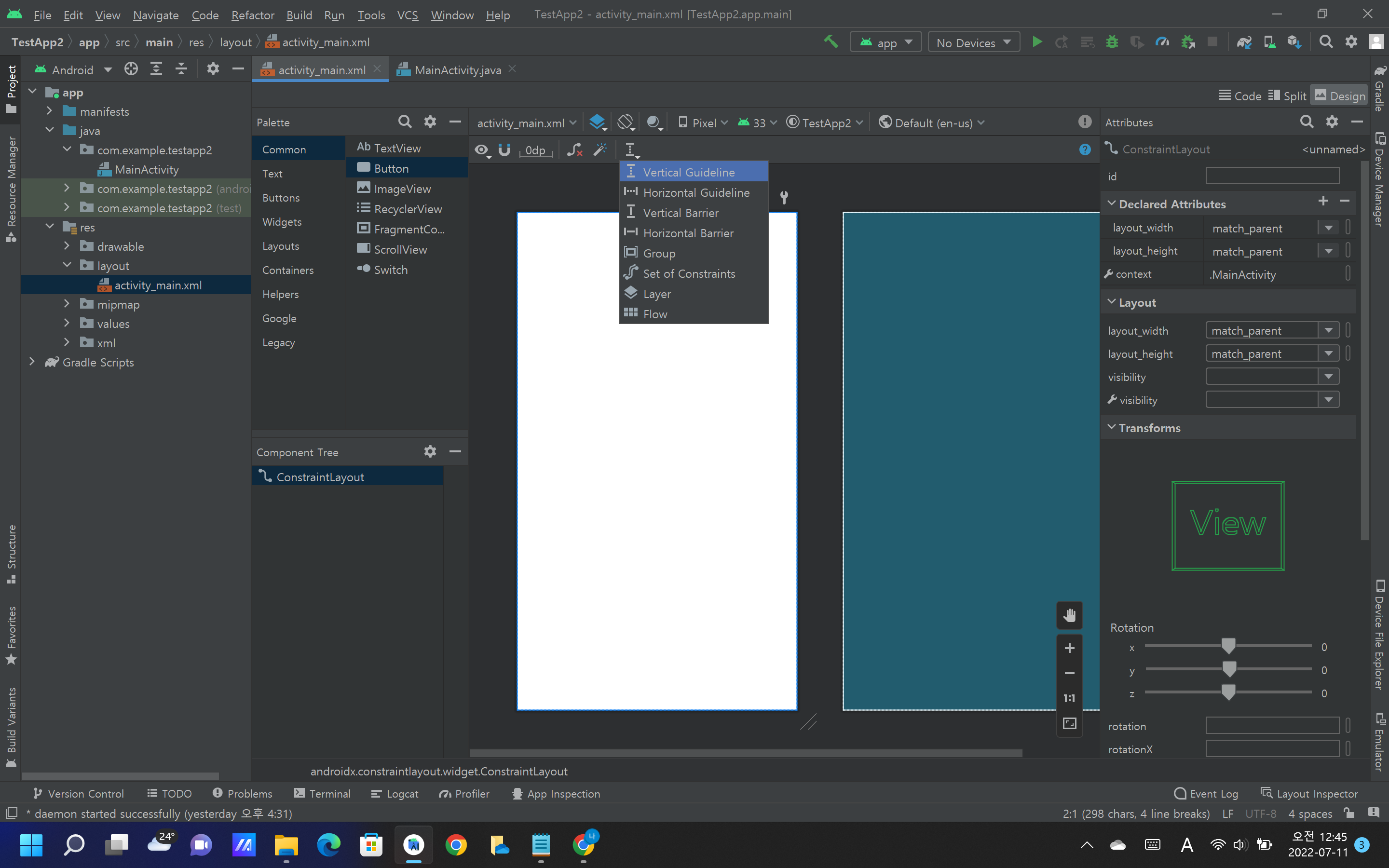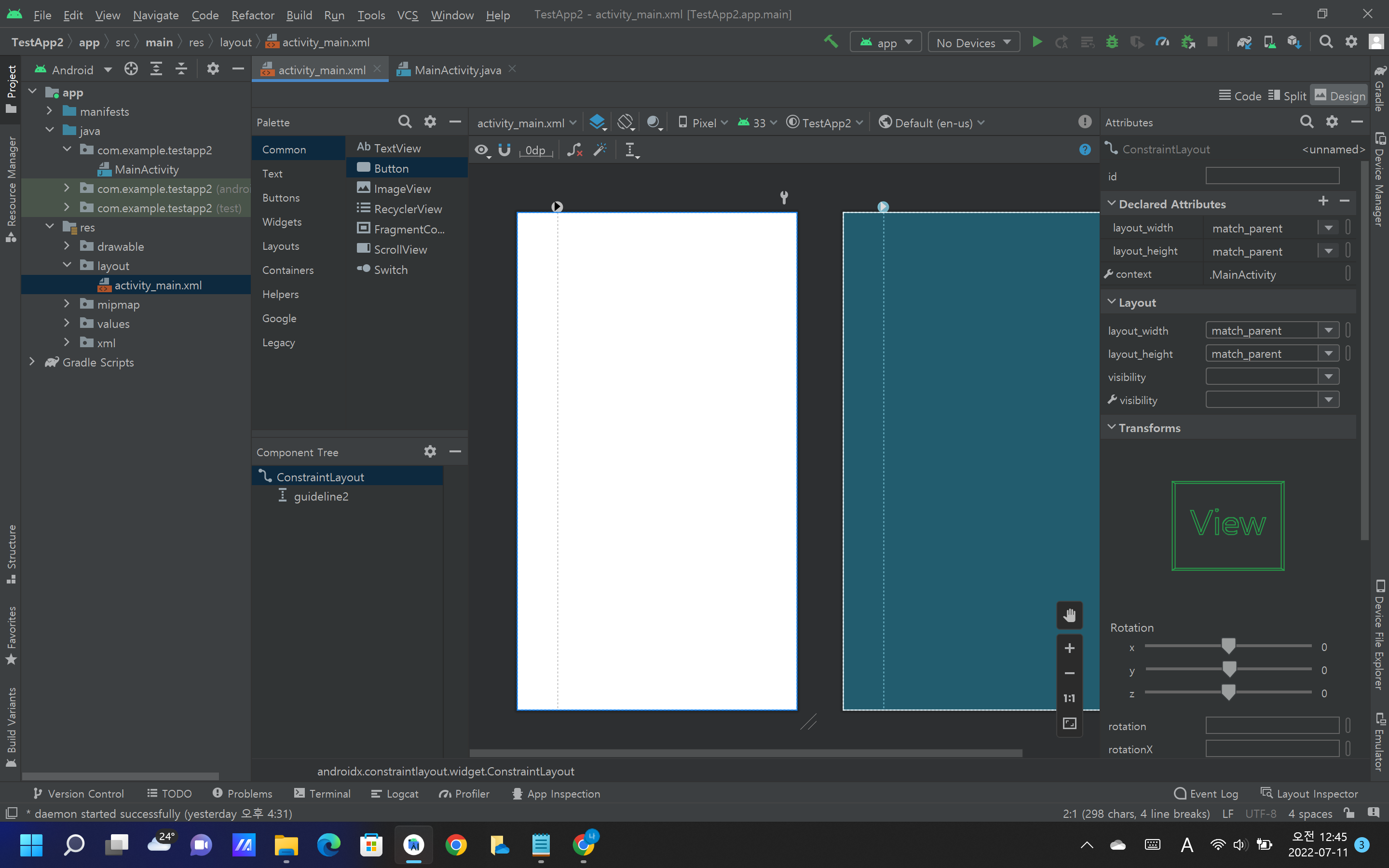 왼쪽 하단에 'Compnent Tree'의 밑에 'Constraint Layout'과 'TextView'가 보일 것이다.