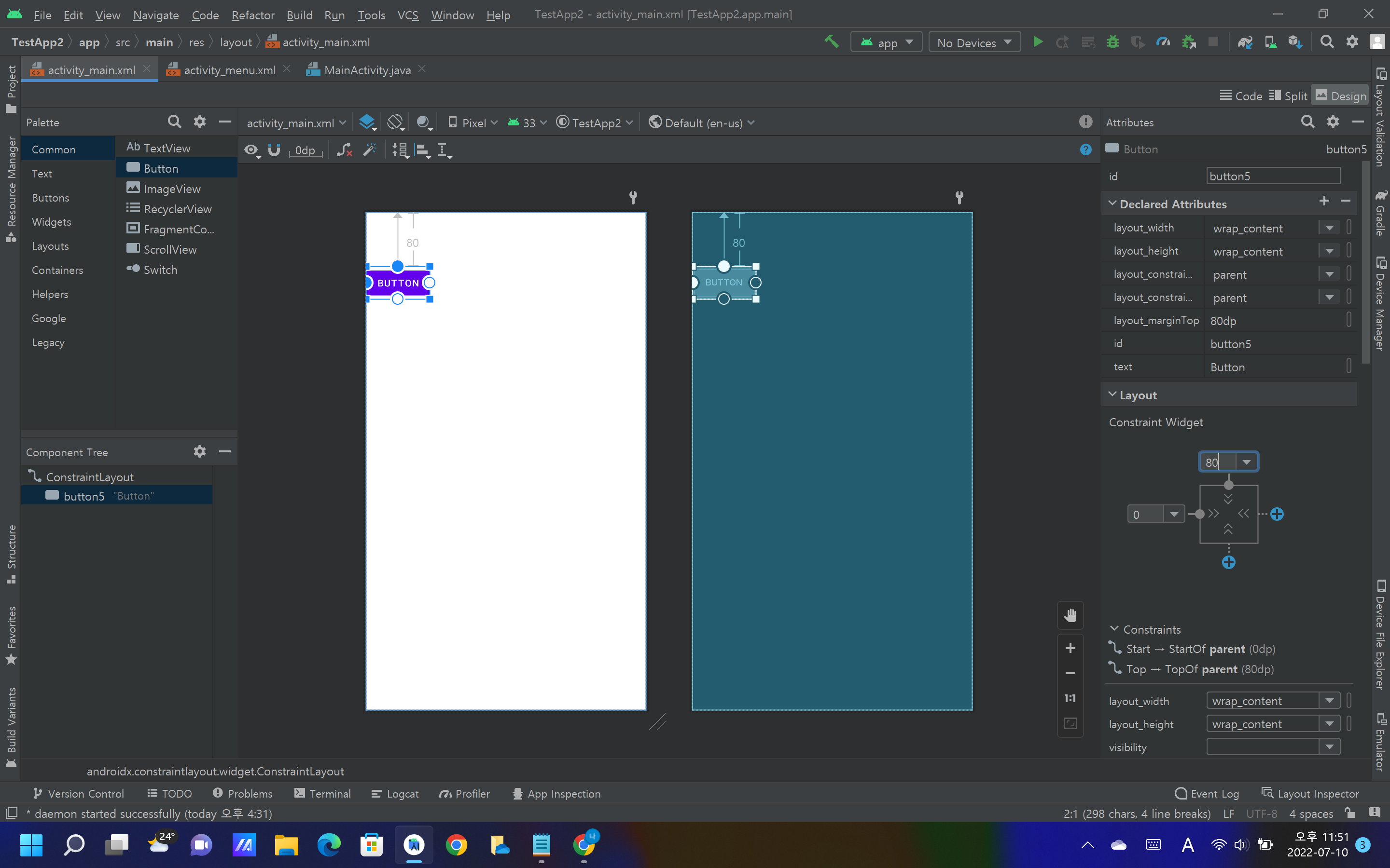 Layout밑에 보면 Constraint Widget이 있는데 여기서 왼쪽을 0, 위쪽을 80으로 바꾸어보니 왼쪽 벽과는 완전히 붙고 위쪽과는 일정 거리를 유지하게 된다. 이는 연결점과 대상과의 거리를 조절할 수 있다.